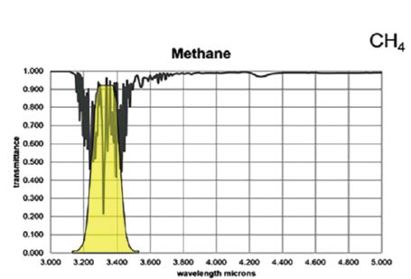 has its own spectral absorption characteristics. When there’s a temperature difference between the cooler gas and the warmer background, light at certain wavelengths passing through the gas is absorbed. For example, natural gas, or methane, absorbs light at 3.3 ± 0.1 μm and 7.7 ± 0.1 μm.