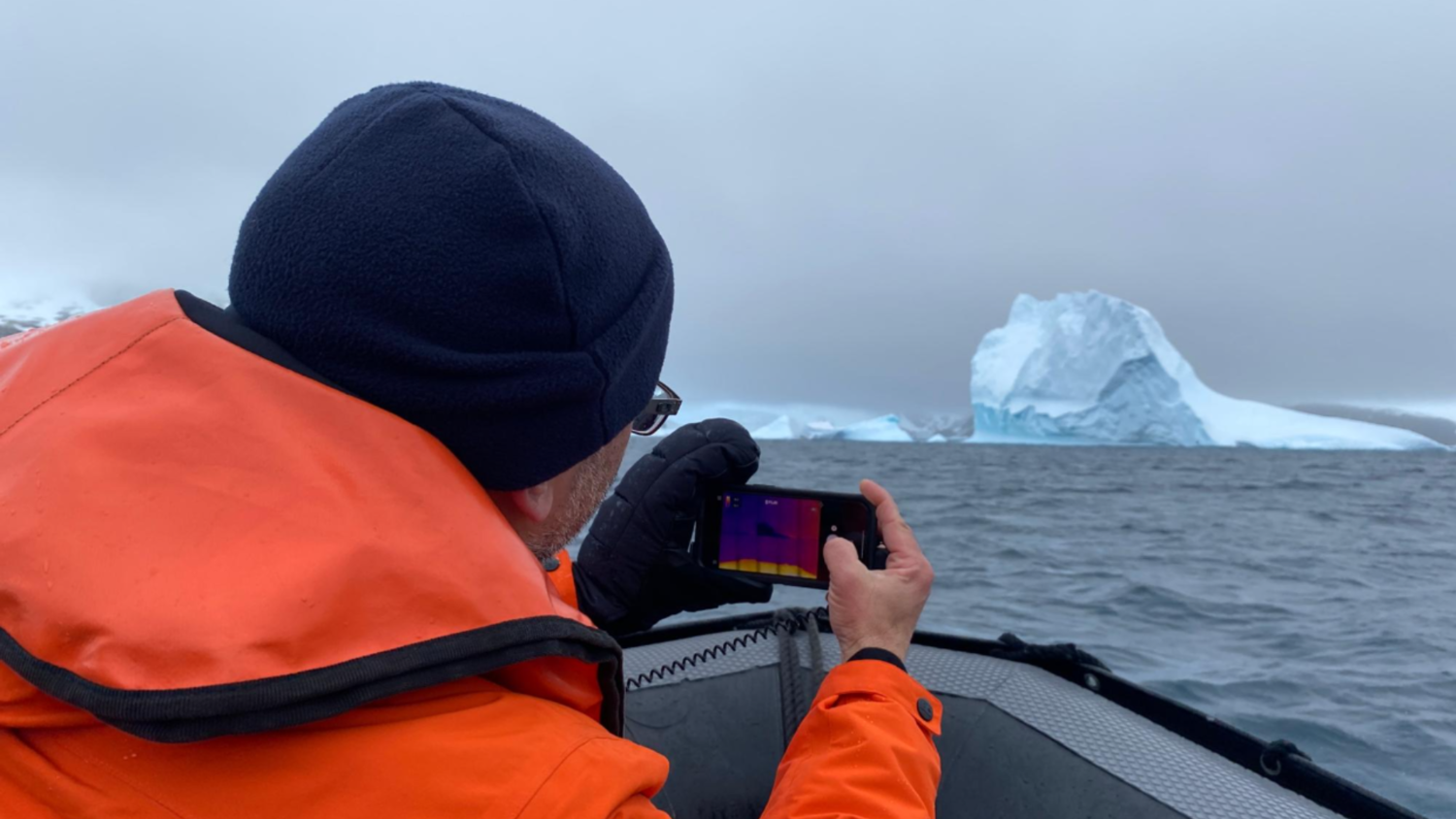 Muise capturing thermal images of an iceberg while kayaking in Antarctic water.