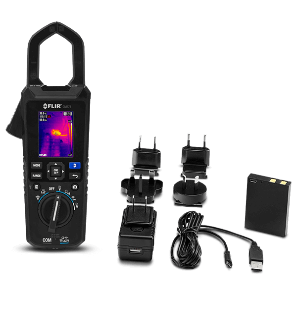 El FLIR CM275-KIT ofrece las herramientas profesionales que necesita para electrónica de campo, electricidad comercial, trabajos industriales ligeros, trabajo de campo y climatización. Mediante la medición guiada por infrarrojos (IGM™), el CM275 proporciona una manera fiable de identificar puntos calientes y circuitos sobrecargados a una distancia segura. Confirme sus conclusiones con la amplia gama de funciones de los medidores de tenazas más las lecturas de temperatura. El FLIR CM275 proporciona también conectividad inalámbrica para la conexión directa con la aplicación FLIR Tools™. El CM275-KIT viene con los accesorios TA04, que incluyen una tapa de batería de repuesto, una batería recargable de polímero de litio, un adaptador de carga de CA con pinzas de entrada de CA internacionales para tomas de corriente y una guía de inicio rápido.