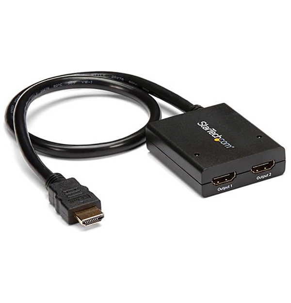 HDMI 2–port video splitter from Startech (manufacturer P/N: ST122HD4KU). Use this product to split an HDMI audio/video source to two separate HDMI monitors, with support for HDMI 4K and power through a nearby USB port.