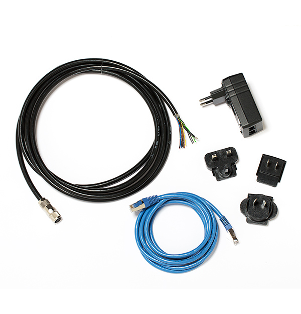 The FLIR Ax5 accessory starter kit consists of the following items: T911183, Gigabit PoE injector 16 W, with multi-plugs, T127605ACC, Cable M12 Pigtail, T951004ACC, Ethernet cable CAT6, 2 m/6.6 ft.