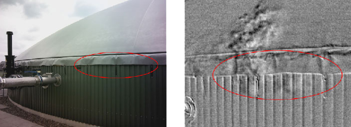 フリアーシステムズの高性能カメラ技術を導入する以前は、ガス検知装置やリークスプレーを用いてバイオガス施設の漏出の点検作業を行っていました。 しかしこうしたツールでは、各システム部位に直接人員が接近しなければならないため、必然的に信頼性が限られてきます。 屋根上にタンクが設置された場所では、リークスプレーやセンサーを頼りに、内部ガス膜、水中ミキサーののぞき窓、タンク壁の穴などの検査を行うことは特に困難であり、場合によっては検査自体が全く行えなくなります。 バイオガス施設全体をこうしたツールで調査する場合、膨大な作業時間を要し、顧客への請求額も高額になります。 その点、FLIR GF320を使用すれば、こうした問題点もほぼ完全にクリアできます。アクセスの困難な部位も、安全な地上から検査すればいいからです。