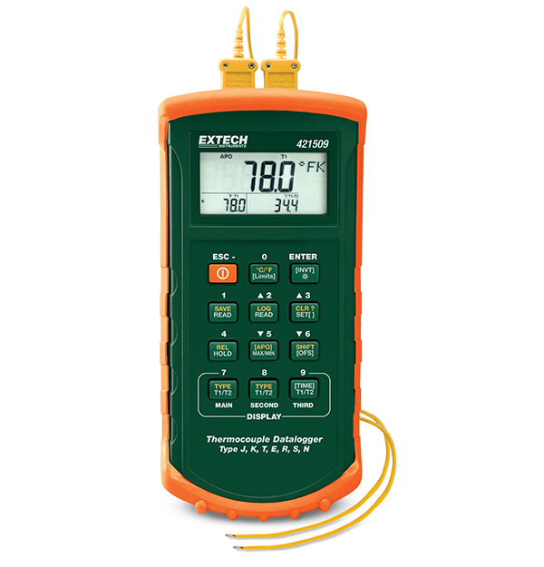 The Extech 421509 is a 7 Thermocouple Dual Input Datalogger with an Alarm. The built in PC interface with an internal memory stores up to 16 data sets and a maximum of 1024 readings that can be downloaded to your PC for storage and analysis. It accepts seven thermocouple types (K,J,T,E,R,S,N), and it features high/low programmable alarms, min/max/average readings, data hold, relative function, auto power off, and a real time clock with calendar. Comes complete with two Type K bead wire temperature probes, software and cable, protective holster, and a 9 V battery.