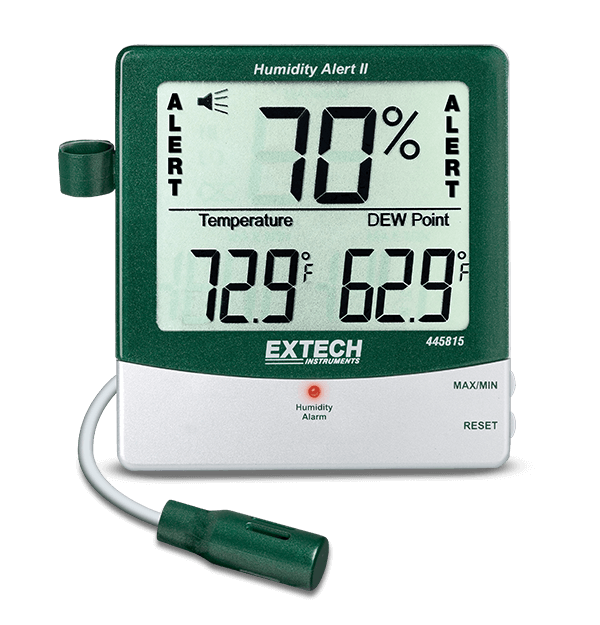 このアラームおよびリモートプローブ付き湿度計は、相対湿度、温度、露点の大型トリプルディスプレイを備えています。机の上に置くことができるスタンドを内蔵していますが、付属のブラケットで壁に取り付けることもできます。湿度レベルが調整可能な設定値を上回る、あるいは下回ると視覚的で聴覚的なアラームが発報されます。また、メーターは最大および最小の読み取り値を保存します。リモートプローブは、壁の後ろで測定するために46cm延長します。カビが気になる湿気の多い場所での使用に最適です。内蔵スタンド、壁取り付けブラケット、単4電池2本が付属しています。