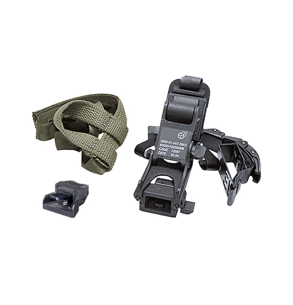 The PASGT Helmet Mount Assembly allows front-mounted, hands-free use of a night vision system when attached to Personnel Armor System for Ground Troops (PASGT) Helmets. Standard fit adjustments and flip up/down functionality give the user complete control over their set-up. Adapter #59 installs onto the Mini Rail of a night vision monocular and connects the device to bayonet-type headsets and helmet mounts.