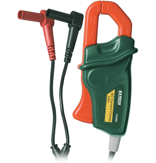 The Extech CA200 is a 200 A AC Clamp Adaptor with 1 mV AC output per amp. It has a 16 mm (0.6 in) clamp jaw and ± 2% accuracy. Comes complete with a built in 163 cm (5.3 ft) cable with banana plugs and a two year warranty.