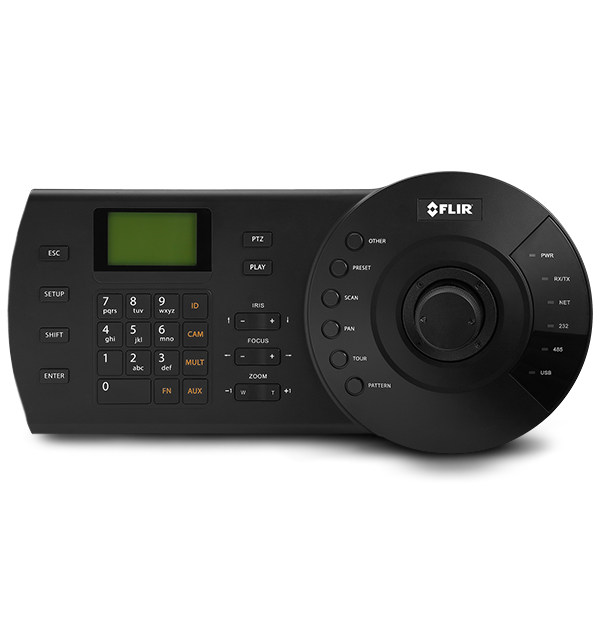 The FLIR CCTV Keyboard for UVMS enables control of PTZ cameras with an easy-to-use 3 axis joystick. The keyboard connects via RS-232 to a UVMS Control Center workstation. The device also allows the user to employ a variety of features on UVMS’ Control Center via keyboard shortcuts.