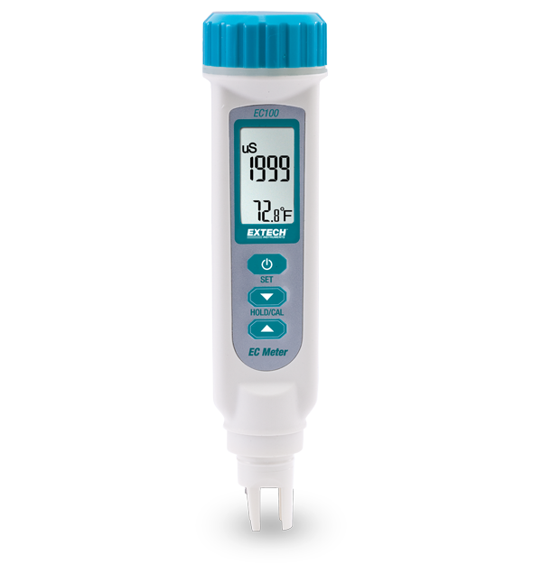 The Extech EC100 is a waterproof (meets IP65 standard) Conductivity/Temperature Meter with a high-accuracy multi-ranging sensor. Features an auto power off with disable. Units of measure include µS/cm, mS/cm, ppm, and ppt. Featuring adjustable automatic temperature compensation, the EC100 includes a protective sensor cap and four LR44 button batteries. Conductivity standards sold separately (required for calibration).