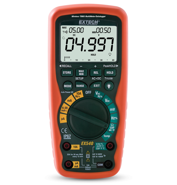 The Extech EX540 offers wireless connectivity to your laptop or PC using a USB receiver with a range comparable to Bluetooth (10 m/33 ft). The EX540 transmits real-time data for monitoring, trending, and analysis (using the included software) on one of two available frequencies (914 MHz). Now electrical professionals can monitor and data log readings at a safe distance from hazardous locations. Additionally, it is easier to perform remote tasks such as powering up a device from a control panel that is not nearby. From a time-saving perspective for laptop users, the EX540 permits a user to set up their laptop at a centralized location and then sequentially data log readings throughout a site without relocating the laptop. In addition to wireless data logging, the EX540 can log up to 9,999 readings internally and also reads voltage, current, resistance, capacitance, frequency (with dual-range sensitivity for electrical and electronic work), duty cycle, continuity, diode testing, and even temperature using its Type K thermistor bead probe. Complete with double-molded test leads, USB wireless receiver (914 MHz), temperature probe, magnetic hanging strap, 9 V battery, and carrying case.