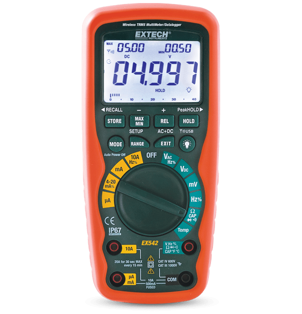 The Extech EX542 offers wireless connectivity to your laptop or PC using a USB receiver with a range comparable to Bluetooth (10 m/33 ft.). The EX542 transmits real-time data for monitoring, trending, and analysis (using the included software) on one of two available frequencies (433 MHz). Now electrical professionals can monitor and data log readings at a safe distance from hazardous locations. Additionally, it is easier to perform remote tasks such as powering up a device from a control panel that is not nearby. From a time-saving perspective for laptop users, the EX542 permits a user to set up their laptop at a centralized location and then sequentially data log readings throughout a site without having to relocating the laptop. In addition to wireless data logging, the EX542 can log up to 9,999 readings internally and also read voltage, current, resistance, capacitance, frequency (with dual-range sensitivity for electrical and electronic work), duty cycle, continuity, diode testing, and even temperature using its Type K thermistor bead probe. Complete with double-molded test leads, USB wireless receiver, temperature probe, magnetic hanging strap, 9 V battery, and carrying case.
