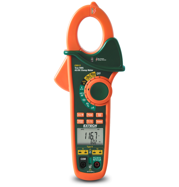 EX613は、非接触型電圧検出器を内蔵した 400アンペアデュアル入力AC/DCクランプメーターです。このTRMS AC/DCクランプメーターには、T1、T2、T1-T2差温測定用のデュアル熱電対入力があります。このDMMは、AC/DCの電圧と電流、抵抗、静電容量、周波数を測定します。その他の機能は次のとおりです。火炎ロッド測定用のDCマイクロアンプ機能、2.8ボルトのダイオード開回路電圧、モーター起動時の電流サージをキャプチャするためのデータホールドと高速ピークホールド、40mFまでの静電容量測定。EX613はLCD画面に40,000カウントを表示し、頑丈な二重成形ハウジングに内蔵されています。テストリード、9Vバッテリー、タイプKビーズワイヤ温度プローブ2個、キャリーケースが付属しています。