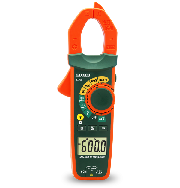 Extech EX650は、600A True RMS ACクランプメータです。また、AC/DC電圧、抵抗、静電容量、導通/ダイオードテストが測定でき、NCV検出器も備えています。EX650は、最大350MCMの導体に対応する30 mmのジョーサイズを備えています。このメーターには、6000カウントバックライト付きLCDディスプレイ、データホールド、最小/最大値、相対値機能、自動電源オフ、便利なLEDワークライトも搭載されています。テストリードと単4電池2本が付属しています。