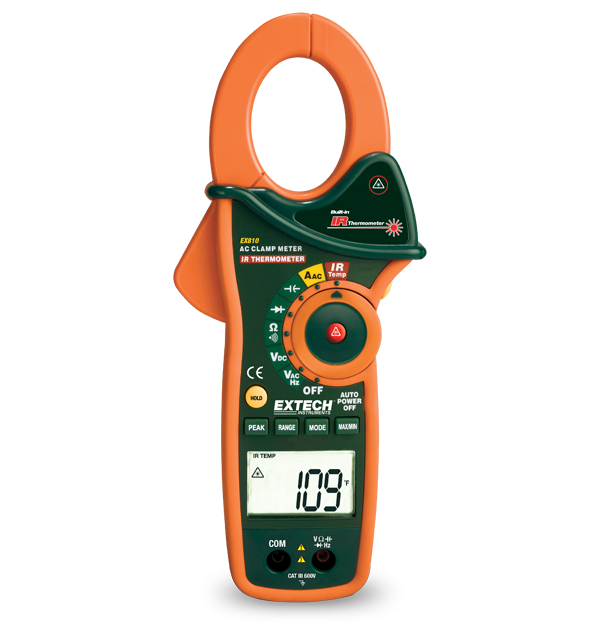 EX810クランプメーターは、-50~270°Cの非接触面測定用のレーザーポインター付き赤外線温度計を内蔵しています。クランプは、最大分解能0.1アンペアで最大1000アンペアのAC電流を測定します。43mmのジョーは、最大750MCMまでの導体の周囲にフィットします。ピークホールドは、モーターの突入電流およびその他のサージをキャプチャします。データホールド、自動電源オフ機能 その他の機能には、AC/DC電圧、抵抗、静電容量、周波数などがあります。テストリード、9Vバッテリー、ケースが付属しています。