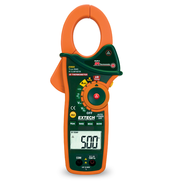 このExtech EX820 True RMS ACクランプメーターは、-50°C~270°Cの非接触面測定用のレーザーポインター付き赤外線温度計を内蔵しています。クランプは、最大分解能0.1アンペアで最大1000アンペアのAC電流を測定します。4.3cmのジョーは、最大750MCMまでの導体の周囲にフィットします。ピークホールドは、モーターの突入電流およびその他のサージをキャプチャします。データ保持、自動電源オフ機能付き。その他の機能には、AC/DC電圧、抵抗、タイプK温度計、静電容量、周波数などがあります。テストリード、タイプK温度プローブ、9ボルトバッテリー、ケースが付属しています。