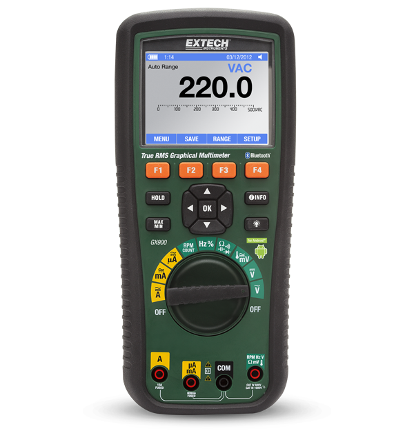 The Extech GX900 is a True RMS Graphical Multimeter with Bluetooth® which transmits key electrical readings to Android mobile devices. The GX900 measures AC/DC current and voltage, resistance, capacitance, frequency, temperature, duty cycle, conductance, RPM, ACV bandwidth, and diode continuity. It features a 50,000 count display with bargraph, a free Android app, data logging (to 2500 readings), Windows compatible software, peak hold, min/max/average modes, relative (%), data hold, automatic data hold, and an auto power off function. Meter comes with double molded test leads, hanging strap, Type K bead wire temperature probe, PC software, and six AA batteries.