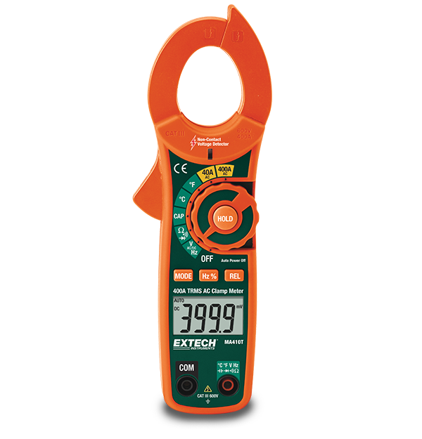 Extech MA410Tは、400A True RMSクランプメーターで、テストリードなしで安全かつ効率的に電流を測定できます。True RMSは、歪みのある波形を測定する際に、より正確な測定値を提供します。内蔵のNCV検出器により、ユーザーはテスト前にライブ配線の有無をすばやく確認することができます。MA410Tのデジタルマルチメーター機能には、AC/DC電圧(600 V)、抵抗(40 MΩ)、静電容量(100 µF)、周波数(10 kHz)、温度(-20°C~760°C/-4°F~1400°F)、デューティサイクル、ダイオード、導通が含まれます。MA410Tは、最大350MCMの導体に対して30mmのジョー開口部も提供します。4000カウントのバックライトディスプレイは、データ保持、相対モード、自動電源オフなどの機能を表示できます。テストリード、汎用タイプKビーズワイヤー温度プローブ、単4電池2個、キャリーケース、ユーザーマニュアルが付属しています。