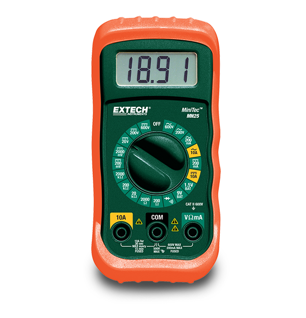 The Extech MN25 MiniTec™ Digital Multimeter has a large, 2,000 count LCD display with a 10 A fuse protection. This meter reads the AC/DC voltage and current, resistance, diode, and continuity. It is capable of running a 1.5 V and 9 V battery test function, and it comes with an overload protection feature with the overload indication signal. This rugged, pocket sized meter is manual ranging and runs eight different functions. The MN25 comes complete with a protective holster, stand, one 9 V battery, and the needed test leads.