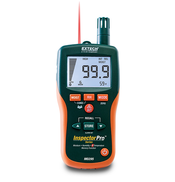 The Extech MO295 is an 8 in 1 meter that combines a pin/pinless Moisture Psychrometer with a built-in Infrared (IR) Thermometer. This pinless moisture sensor allows users to measure moisture in various types of wood and building materials with virtually no surface damage, and the remote pin-type probe can be used for contact moisture readings in hard to reach areas. The built in humidity and temperature probe measures relative humidity, air temperature plus grains per pound (GPP), dew point (DP), and vapor pressure. MO295 can store and recall 20 readings in memory. It also features a fast analog bargraph for viewing moisture trends, programmable high/low moisture and humidity alarms, automatic calculation of differential temperature to determine condensation point, min/max function, data hold, and an auto power off function. Comes with a pin moisture probe (MO290-P), one 9 V battery, carrying case, and user manual. Optional specialty moisture probes are available.