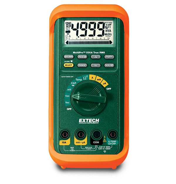 The Extech MP530A is a 5000 count, True RMS auto ranging Multimeter that measures AC/DC voltage and current, resistance, temperature, capacitance, and frequency with a 0.08% basic accuracy. Additional features include diode test, continuity check, auto power off, data hold, and low resistance auto lead zero, all on an easy to read, backlit display. Includes protective holster with built-in stand, test leads, Type K bead temperature probe, and 9 V battery.