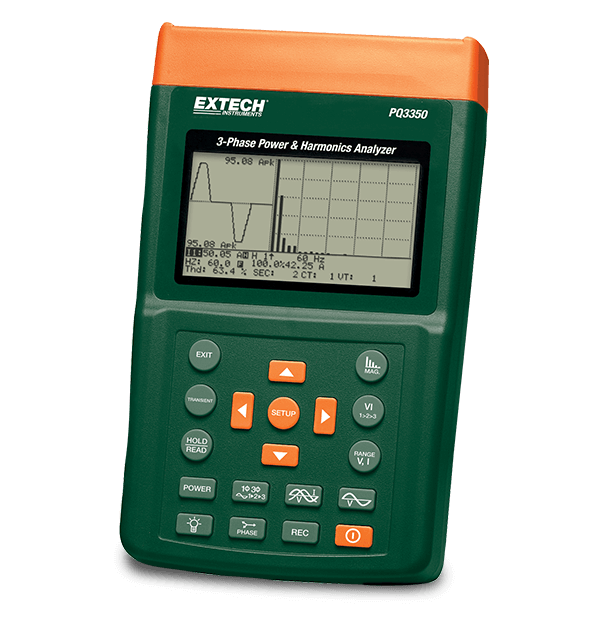 Extech PQ3350は、単相および3相/3線または3相/4線のシステム向けに構築された3相電源および高調波アナライザーです。大型のバックライトLCDは、1つの画面に最大35個のパラメータを表示します。PQ3350では、データは最大52,428の単相読み取り値または17,476の3相読み取り値を記録し、ピーク値を含む全高調波歪み(THD-F)と波形を同時に表示します(1024サンプル/期間)。ワニ口クリップと格納式プランジャークリップ付きの4本の電圧リード線、単3電池8本、ユニバーサルACアダプター、ソフトウェア、USBインターフェースケーブル、ケースが付属しています。電流プローブは別売りです。