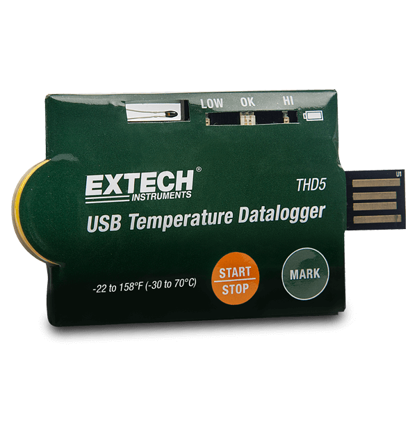 Extech THD5は、1回限り使用のUSB温度データロガー10個セットです。10個のデータロギングユニット(それぞれにCR2032ボタン電池とプラスチックバッグ付き)を備えた製品。THD5は、長バッテリー寿命(約1年)、ユーザーがプログラム可能な設定、赤と緑のLEDによるステータス表示を備えたポータブルな製品です。
