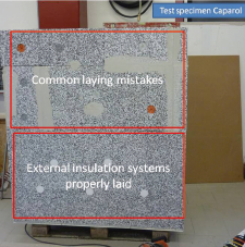 外部断熱システムの設置を特徴付ける熱的現象を研究するため、試験片を作成してその三辺を断熱パネル(グラファイト添加物を含むEPS)で覆いました。 試験片の上部では一般的な敷設ミスとなるように壁を覆い、下部はEPSのダボありとなしで適切に準備しました。