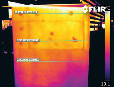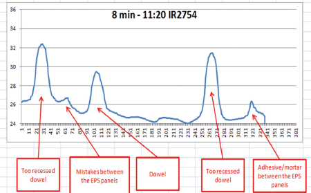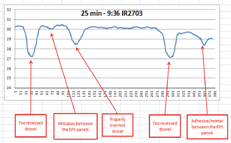 熱分析によって、2つの異なる種類の表面層があることが分かります。熱伝導率が低く熱容量の限られた断熱材の層と、熱伝導率が高く熱容量の大きな接着剤とPVCダボの層です。 サーモグラフィ分析を実施する際に、サーモグラファーは表面の異常として何が確認され得るかを把握している必要があります。外部断熱システムおよび、適切な環境条件下においてどのような状態が欠陥とみなされるのかを理解する必要があるのです。