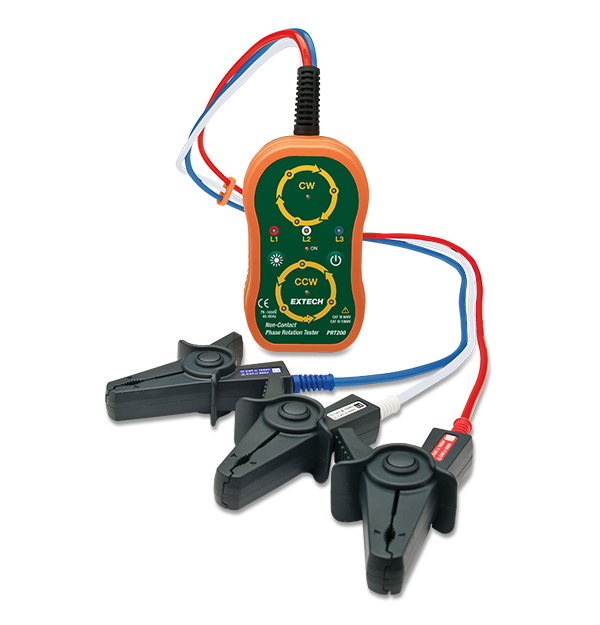 The Extech PRT200 is a non-contact phase sequence tester with a 75 to 1000 VAC input voltage and 45 to 65 Hz frequency range. This tester features LEDs that indicate whether each phase is live and that phase's orientation; a beeper sounds intermittently when correct phase is detected and continuously if phase is reversed. An adjustable Hi/Lo LED brightness switch makes it easy to take measurements in dimly lit areas or sunlight, while the CAT IV 600 Volt safety rating plus fully-insulated, wide-jaw alligator clips mean it's appropriate for industrial applications. The PRT200 comes complete with a year warranty, three built-in 30 in. test leads with large color-coded alligator clips, 4 AA batteries, and a pouch case.