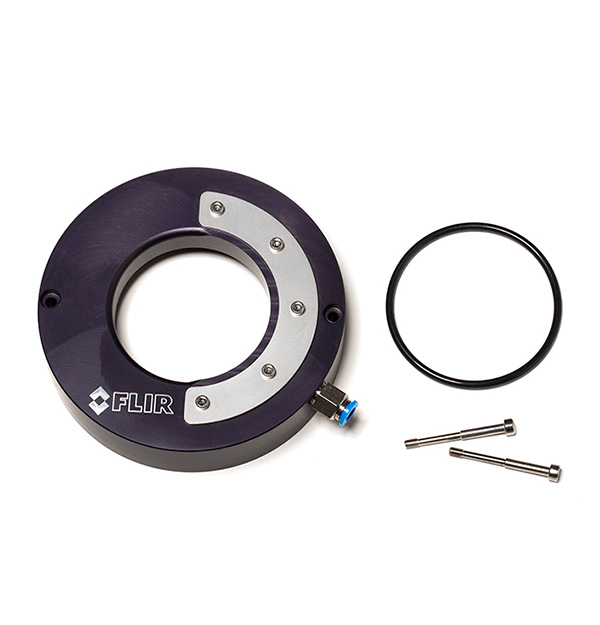 Dust control ring to be mounted on the front window of FLIR A310f cameras. The dust control ring is then connected to pressurized air and will keep the front window dust-free.