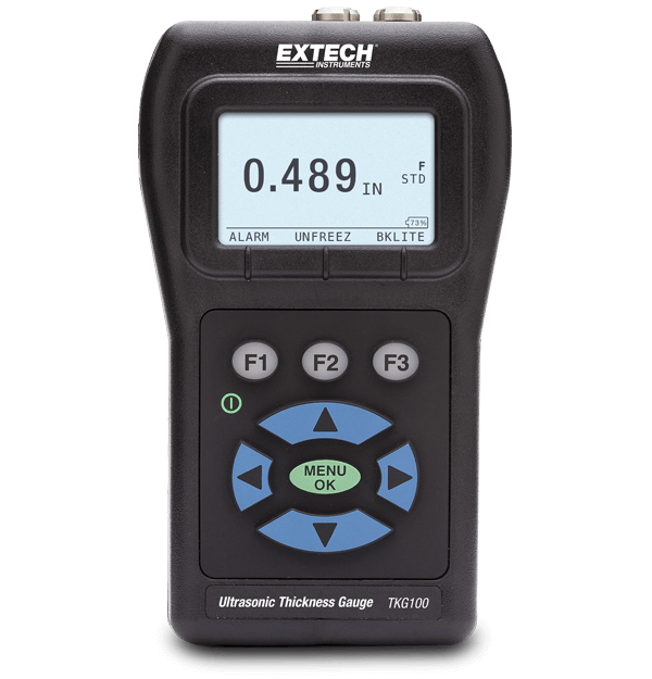 The Extech TKG100 offers Thickness Gauges designed in compact, handheld, rugged housing ideal for field use. The ultrasonic technology allows for non-destructive thickness measurements for primarily steel structures. It includes multiple transducer options for high temperature and difficult to measure materials. Complete with 2oz bottle of coolant, 2 AA batteries, 5 MHz Transducer, and hard carrying case.