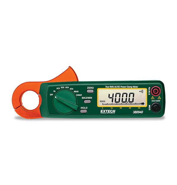 The compact Extech 380940 is a 400 Amp mini True RMS AC/DC power clamp meter. It has a small-diameter jaw designed to reach in small areas while providing power calculations up to 240 kW. With the added convenience of instant watt readings, a feature normally reserved for full-size meters, this mini power clamp is useful for essential troubleshooting tasks in plant maintenance, electrical, HVAC, and telecom work, as well as residential electrical repairs, energy audits, fleet maintenance, marine, and motorcycle repair. Complete with test leads, 2 AA batteries, and carrying case.