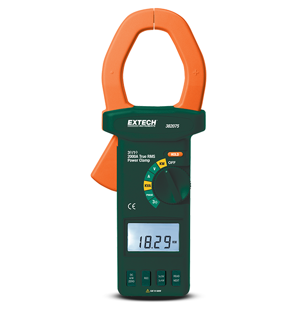 The Extech 382075 is a 3-Phase True RMS Clamp-on Power Analyzer which can be used on 3 and 4 wire balanced or unbalanced loads. It can measure reactive and apparent power up to 1200 kW. Additional measurements include watts, voltage, current, frequency, power factor, and phase angle. It can display lead, lag current, and voltage phase shift in degrees, plus it can also store and recall the previous 4 readings. Additional features include DC current auto zero, data hold, min/max, and relative mode. Comes complete with test leads, carrying case, and 9 V battery.