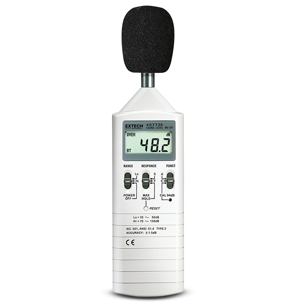 The Extech 407736 Dual Range Sound Level Meter measures from 35 dB to 130 dB ±1.5 dB, and it meets both ANSI and IEC Type 2 standards. It features a fast and slow response time, A/C weighting, max hold function, and an analog AC/DC output for connection to an analyzer or recorder. Comes complete with microphone wind screen, 9 V battery, and carrying case.
