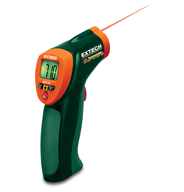 The Extech 42510 is a wide range Mini IR Thermometer. This meter measures non-contact surface temperature from -50°C to 538°C (-58°F to 1000°F). It features audible and visible over range indicators, while also having an 8:1 distance to target ratio with a built-in laser pointer for easy targeting. Complete with 9 V battery and carrying case.