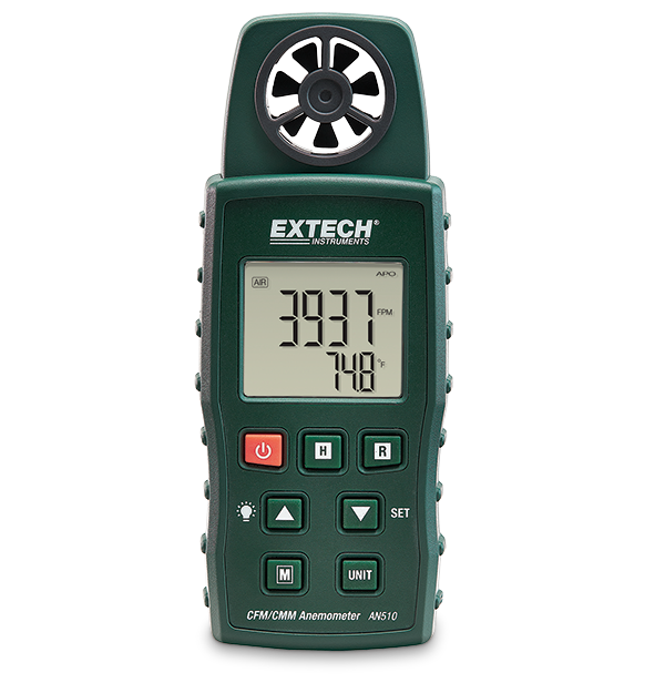 The Extech AN510 is a convenient 4-in-1 Anemometer that measures air velocity, air flow, air temperature, and Type-K temperature. Includes a built-in low friction ball bearing mini vane wheel for high accuracy. The Type-K temperature probe function measures surface temperature up to 1300°C (2372°F). It features large dual LCD with backlighting, data hold, and min/max function.