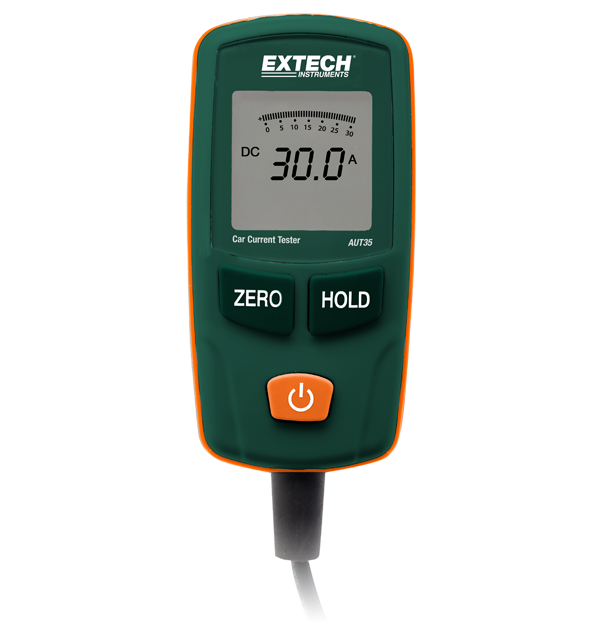 Check up to 30 Amps without breaking the circuit with the Extech AUT35 Current Tester. Mini-blade and ATC blade connectors plug into the fuse block. It has a measuring range of 30 Amps/48 VDC (10 seconds max) with 100 mA resolution and ± a (2% + 2 digits) accuracy. Results are displayed on a 3.5-digit LCD with a bargraph. Includes alligator clips.
