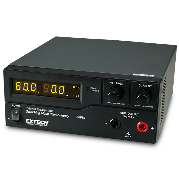 The highly efficient Extech DCP60 incorporates upgraded SMPS circuitry with small form factor, benefits from an automatic cross over for CC and CV, has three voltage/current presets, and can be controlled remotely. The DCP60 is perfect for solving a variety of loading conditions and applications. With the 60 V/10 A output, the maximum current can be limited to 5 A using the auxiliary output on the front panel (10 A main output is available on the back panel). The DCP60 also provides dual action rotary encoder control with a push knob for fine and coarse tuning. It enables the quick setting of voltage, current, and three user-defined voltage and current presets. The USB port is avaliable for programming and running ramp and soak cycles with 20 programmable sets of voltage/current and varying test durations (up to 999 cycles). Complete with power cords.