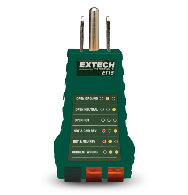 Extech ET15는 3 와이어 리셉터클의 배선 결함을 테스트합니다. 5개의 배선 결함을 감지합니다. 표시등은 회로 상태를 나타냅니다. 표준 북미 3구 플러그 콘센트와 호환됩니다.