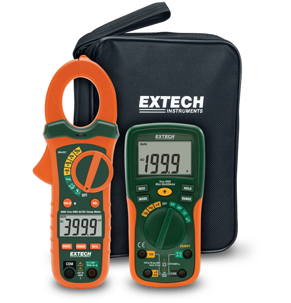 The Extech ETK35 is an Electrical Test Kit with a True RMS meter to provide all the electrical testing needs for installation and repair of electrical systems, HVAC equipment, and large appliances. It also has an AC/DC clamp meter for automotive and motor applications. The True RMS Digital Multimeter auto ranges, has a 2000 count large LCD display, low current capability with resolution to 0.1 µA, and a max hold function. The 400 A True RMS AC/DC Clamp Meter + NCV tests AC/DC current and voltage, resistance, frequency, capacitance, temperature, diode, and continuity. Both tools feature a data hold and auto power off function.