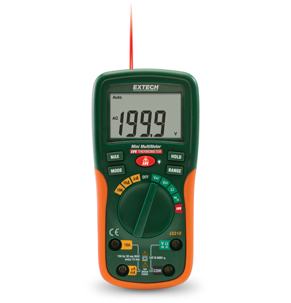 The Extech EX210 is a Mini Digital MultiMeter with a built in IR Thermometer. The meter can quickly identify overheating motors and locate hot spots on electrical panels or HVAC vents without contact. It measures AC/DC voltage, AC/DC current, resistance, and temperature (IR). The EX210’s rugged design incorporates a 2000 count large backlit dual LCD with easy to read digits, low current capability measure down to 0.1 µA, and input fuse protection. This meter also features max hold and data hold capabilities as well as auto power off. The EX210 comes complete with test leads and a 9 V battery.