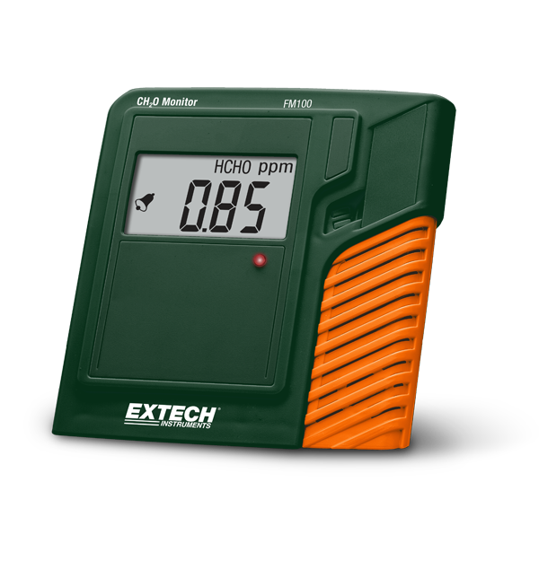 Extech FM100은 다리 받침대가 기울어지는 실내용 소형 포름알데히드 모니터입니다. 약 6초 주기로 포름알데히드 농도, 공기 온도 및 상대 습도 판독값을 교대로 표시합니다. FM100은 청각 및 시각 경보, 영점 재보정 기능, 수동 온도 및 상대 습도 보정(조정 가능), 신선한 공기의 CH2O 보정 기능, 배터리 부족 표시기를 모두 갖추고 있습니다. 제품은 CE 인증을 받았으며 1년 보증을 제공합니다. 범용 AC 어댑터(US, EU, UK 및 AU 플러그 포함), 사용 설명서 및 AAA 배터리 4개가 포함되어 있습니다.