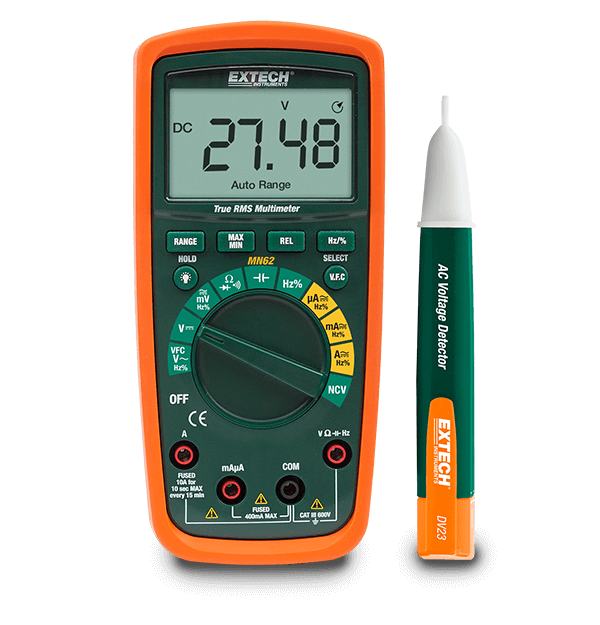 Extech MN62-K는 소형 트루 RMS 멀티미터로 무료 비접촉식 전압 감지기(NCV)가 함께 제공됩니다. 멀티미터를 사용하면 노이즈가 있거나 왜곡되거나 사인파가 아닌 파형을 정확하게 판독할 수 있으며 전압 감지기는 50V~600V(50Hz/60Hz)를 감지할 수 있습니다. 이 두 제품은 가전제품, 전기 배선, 자동차 수리 및 전자 장치의 문제 해결 작업에 적합합니다.