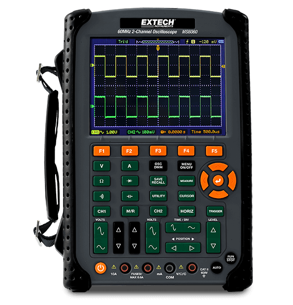 The Extech MS6060 is a 60 MHz, 2-Channel Digital Oscilloscope. The 14.2 cm (5.6 in) color LCD display shows up to 23 automatic measurements. Also included is a waveform recorder to capture/replay input waveforms from CH1 and CH2 with a maximum record length of 1000 frames. Store and recall up to 1000 waveform screens and setups using the installed 2G microSD card. it features an easy to use pop up menu with a built in, multi language system, plus an automatic cursor to track measurements. Complete with two 1 X/10 X oscilloscope probes, test leads, 7.4 V Li-Ion battery, universal AC charger, and carrying case.
