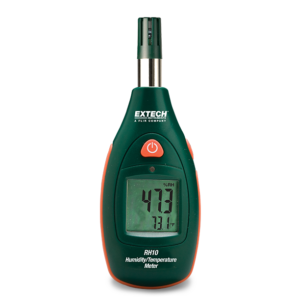 The Extech RH10 is a Pocket Series Hygro-Thermometer with an automatic LCD backlight and double molded grip. The meter measures relative humidity from 0% RH to 100% RH, temperature from -20°C to 60°C (-4°F to 140°F), and records max/min readings. This product is complete with a 9 V battery and built in sensor.