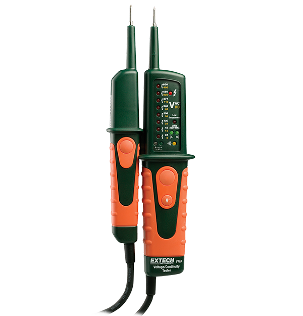 Extech VT10 다기능 전압 테스터에는 24V, 48V, 120V, 208V, 240V, 277V, 480V 및 600V에 대한 LED AC 전압 표시와 6V, 12V, 24V, 36V, 48V, 110V, 220V 및 400V에 대한 LED DC 전압 표시가 있습니다. 이 테스터에는 양극 및 음극 DC 표시에 대한 LED로 극성 감지 기능이 있습니다. 신호음으로 연속성 테스트를 실행할 수 있습니다. 모터의 위상 회전 테스트, 저 임피던스 테스트를 위한 양손 작동 테스터. 또한 이 테스터에는 저조도 또는 좁은 영역에서 테스트할 수 있는 플래시라이트가 내장되어 있습니다. 전압 기능은 배터리 없이 작동하며 고무 처리된 이중 성형 IP64 하우징을 갖추고 있습니다.