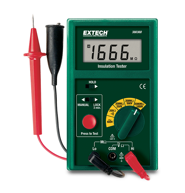 The Extech 380360 is a 1000 V Megohmmeter with an automatic 3 minute test. It has three test voltages of 250 V, 500 V and 1000 V, plus insulation resistance up to 2000 MΩ. Automatic discharge when the safety "Press to Test" button is released. Complete with 6 AA batteries, heavy duty 0.8 m (2.5 ft) test leads, alligator clip, large probe, and case with neck strap.