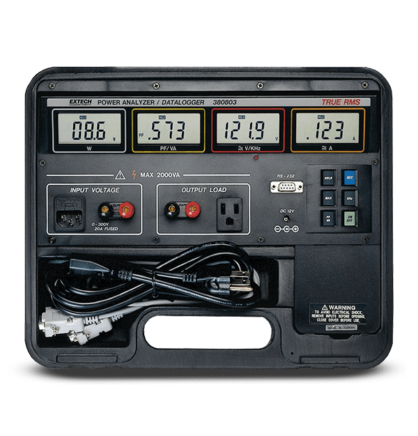 The Extech 380803 is a True RMS Power Analyzer and Datalogger. This power analyzer simultaneously displays the wattage, power factor (VA), voltage or frequency (Hz), and current (Amps) of the device or appliance tested. The built-in datalogger can store up to 1,012 readings, or you can save data directly to your PC using the RS-232 port and included software. Additional features include max hold, data hold, and overload protection. Battery or AC Adaptor Operation provides line isolation. Comes complete with 8 AA batteries, software, cable, power cord, AC Adaptor, and case.