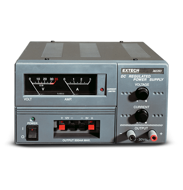 The Extech 382203 is an Analog Triple Output DC Power Supply with overload and short circuit protection. Featuring constant voltage and current supply, the 382203 has a current limiting, front panel, LED indicator and binding post terminals for variable supply. Complete with power cord.