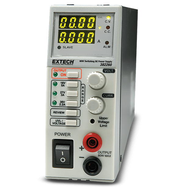 Extech’s 382260 is an 80 W Switching Mode DC Power Supply. Its has three selectable output ranges that perform like three power supplies in one: 0 V to 16 V (0 A to 5 A), 0 V to 27 V (0 A to 3 A), and 0 V to 36 V (0 A to 2.2 A). This compact and lightweight unit provides easy portability and is ideal for tight workbenches with limited space. The 382260 features 4-Digit LED displays, front and rear output terminals, and remote sensing for accurate applied voltage at load point. Complete with AC Power cord.