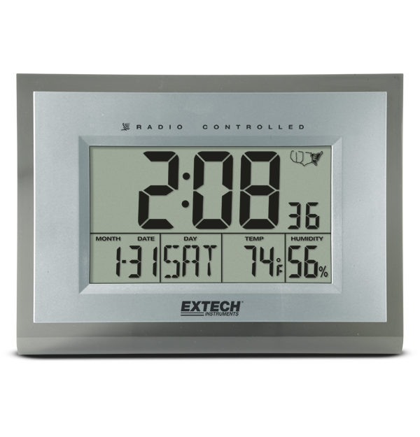 445706 是一款提供 5 种语言的大尺寸数字桌面或壁挂式闹钟。它可以测量温度、湿度,并具有最低/最高功能。日历可显示星期、日期和月份。附送桌面支架和两节 AA 电池。